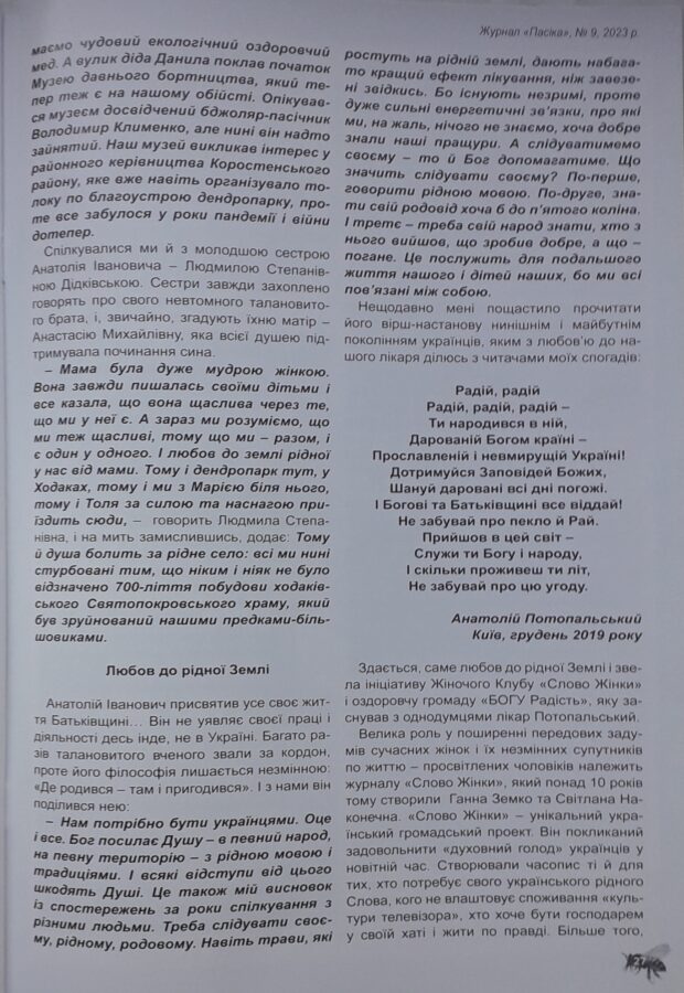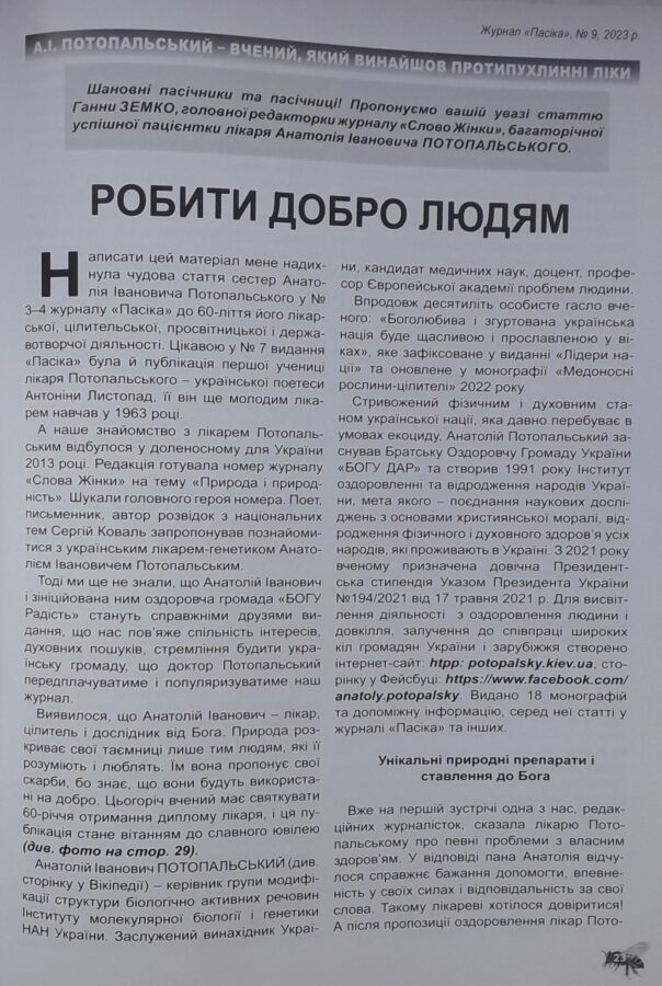 Тоді ми ще не знали, що Анатолій Іванович і зініційована ним оздоровча громада «БОГУ Радість» стануть справжніми друзями видання, що нас пов’яже спільність інтересів, духовних пошуків, стремління будити українську громаду, що доктор Потопальський передплачуватиме і популяризуватиме наш журнал.