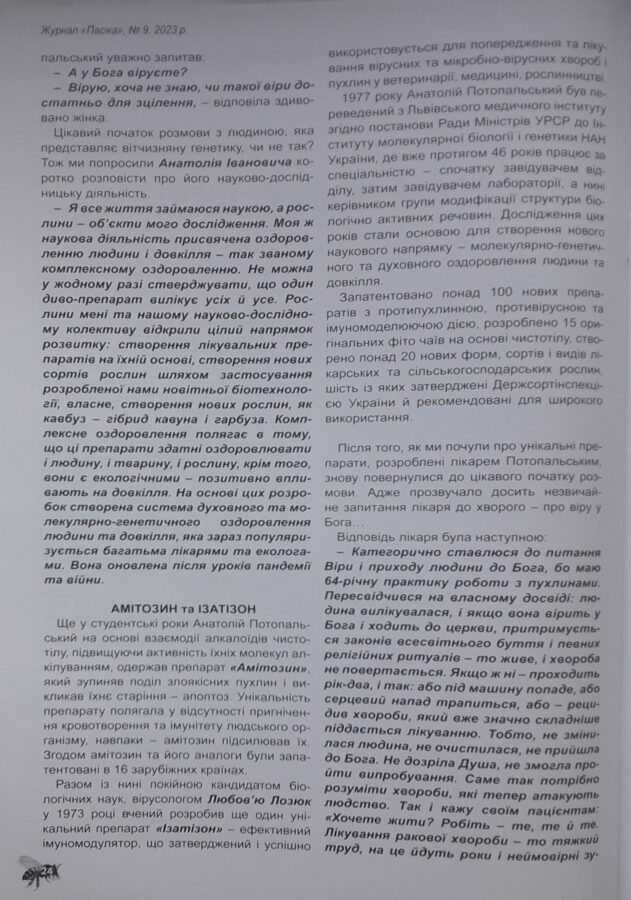 Після того, як ми почули про унікальні препарати, розроблені лікарем Потопальським, знову повернулися до цікавого початку розмови. Адже прозвучало досить незвичайне запитання лікаря до хворого — про віру у Бога…