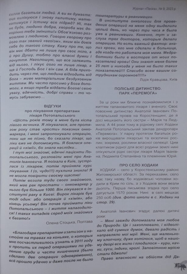 Потім возила туди свого знайомого, який мав рак простати — онкомаркер у нього був більше 1000. Він лікувався в інституті раку в Києві. Вирок лікарів був тоді один: або операція й «хімія», або кінець усьому! Він почав приймати ліки Потопальського — і життя налагодилося! І таких випадків серед моїх знайомих є багато!»