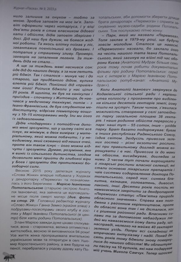 Коли Анатолій Іванович звернувся до Ходаківської сільської ради і керівництва колгоспу з проханням про виділення кількох десятків гектарів землі, йому пішли на зустріч. Таким чином, з’явилася можливість створення у селі заповідного парку загальною площею 38 гектарів. І наше родинне обійстя переросло у парк: наші тут — 55 соток, інше — угіддя парку. Брат багато подорожував: бував в інших республіках Радянського Союзу, їздив світом. Звідусіль привозив зелених гостей — різні екзотичні рослини, які при правильному догляді можна вирощувати і в нас. Привозив їх до мами на обійстя, висаджував, доглядав за ними. З часом тут почали вирощувати й лікарські рослини власної селекції, які стали основою лікарських препаратів і чаїв системи оздоровлення доктора Потопальського, серед них: синюха блакитна, ехінацея, головатень, дивосил, лаконіс, інші. Десятки років поспіль ми намагаємося закріпити за дендропарком «Перемога» статус «Пам’ятка природи обласного значення». Справа вже погоджена з районним керівництвом, проте до області вона так і не дісталася, хоч і є рішення районної ради. Власними силами та за допомогою небайдужих людей ми намагаємося йому дати раду, що, насправді, нелегко на майже 40 гектарах зелених угідь. Попри всі складнощі не втрачаємо ентузіазму і надії. Понад десять років тому бджоли знову повернулися до нашого обійстя! Ми облаштували пасіку на 10 вуликів, які нам подарував мій учень Микола Самчук. Тепер щоосені чаємо чудовий екологічний оздоровчий мед. А вулик діда Данила поклав початок Музею давнього бортництва, який тепер теж є на нашому обійсті. Опікувався музеєм досвідчений бджоляр-пасічник Володимир Клименко, але нині він надто зайнятий. Наш музей викликав інтерес у районного керівництва Коростенського району, яке вже навіть організувало толоку по благоустрою дендропарку, проте все забулося у роки пандемії і війни дотепер.