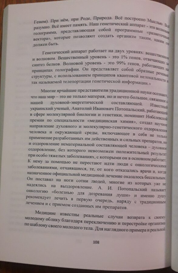 “Багато найяскравіших представників традиційної науки усвідомлюють, що наш світ – це дещо більше, ніж матерія, він складається ще й з духовно-енергетичної складової. Відомий український вчений, Анатолій Іванович Потопальський, який працює у сфері молекулярної біології та генетики, номінант Нобелівської премії за спеціальністю «медична хімія», створив науковий напрямок духовного та молекулярно-генетичного оздоровлення людини та довкілля, який включає в себе не лише застосування розроблених ним дієвих та сильних препаратів, а й оздоровлення нематеріальної складової людини – духовне оздоровлення, без якого неможливий позитивний результат при особливо важких захворюваннях, з якими він в основному і працює. До нього за допомогою продовжують йти люди з онкологічними захворюваннями, які зневірилися, ті, від кого відмовилися лікарі і коли призначене офіційною медициною лікування виявилося безсилим. Він поставив на ноги сотні людей, багато з яких вже не сподівалися на одужання. А. І. Потопальський називає онкологію «хворобою для дозрівання душі» і саме душу рекомендує лікувати в першу чергу, паралельно із традиційним лікуванням та з прийомом створених ним препаратів.”