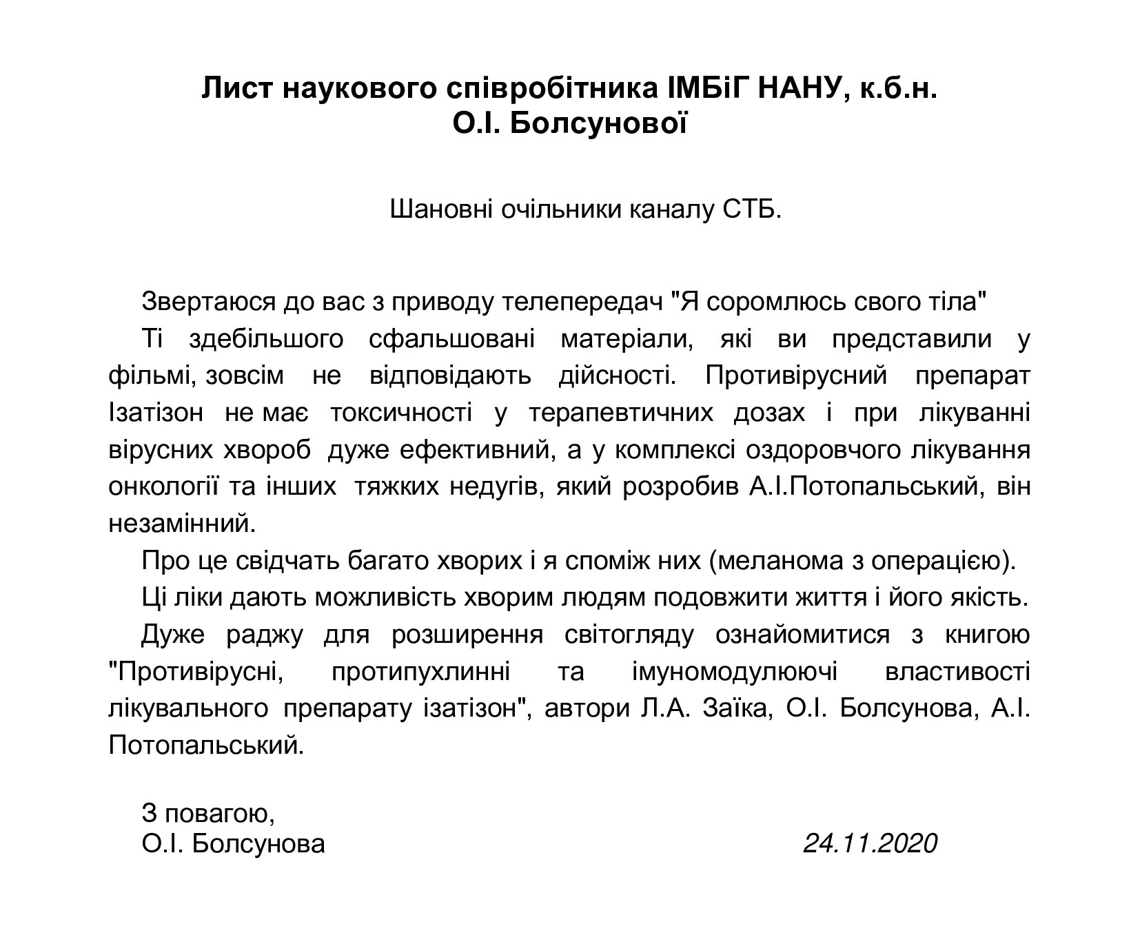 Шановним співробітникам телепрограми “Я соромлюсь свого тіла” телеканалу СТБ. Після ознайомлення з матеріалами телепрограми “Я соромлюсь свого тіла” від 15. 11. 20. з участю пацієнта з раком губи в занедбаній стадії захворювання. Ця проблема є актуальною в онкології. Перебіг хвороби буває різним, високий рівень захворюваності в молодому віці, смертності та інвалідизації хворих, привертає увагу всіх онкологів світу. …