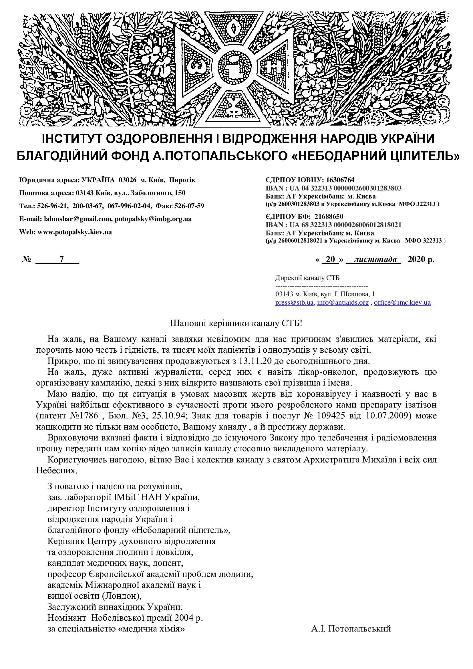 Відповідь А.І. Потопальського на численні запитання після виходу передачі на СТБ